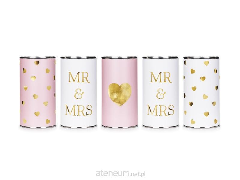 Puszki weselne do dekoracji samochodu Mr & Mrs, ze sznurkiem i tasiemkami, wymiary 14 x 7 cm.(1 op. / 5 szt.)