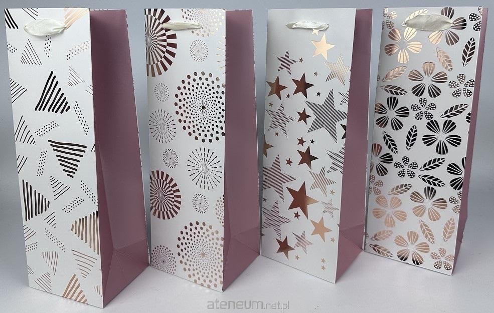 Torebka prezentowa na butelkę Premium. Materiał karton 210 gr. Złocone elementy ozdobne. Uchwyt z tasiemki. Mix 4 wzorów. Towar wydawany losowo.