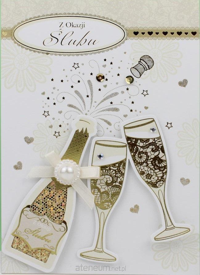 "Kartka okolicznościowa Ślubna LUX z życzeniami. USZLACHETNIENIA: w zależności od projektu graficznego pojawia się: folia (złota, srebrna, multikolor-holografik), elementy 3D, cekiny lub cyrkonie. Zrobione metodą hotstampinku. (metalik) Do każdej kartki dołączona jest koperta 100 gsm w pasującym do projektu kolorze. Całość zabezpieczona jest folią."