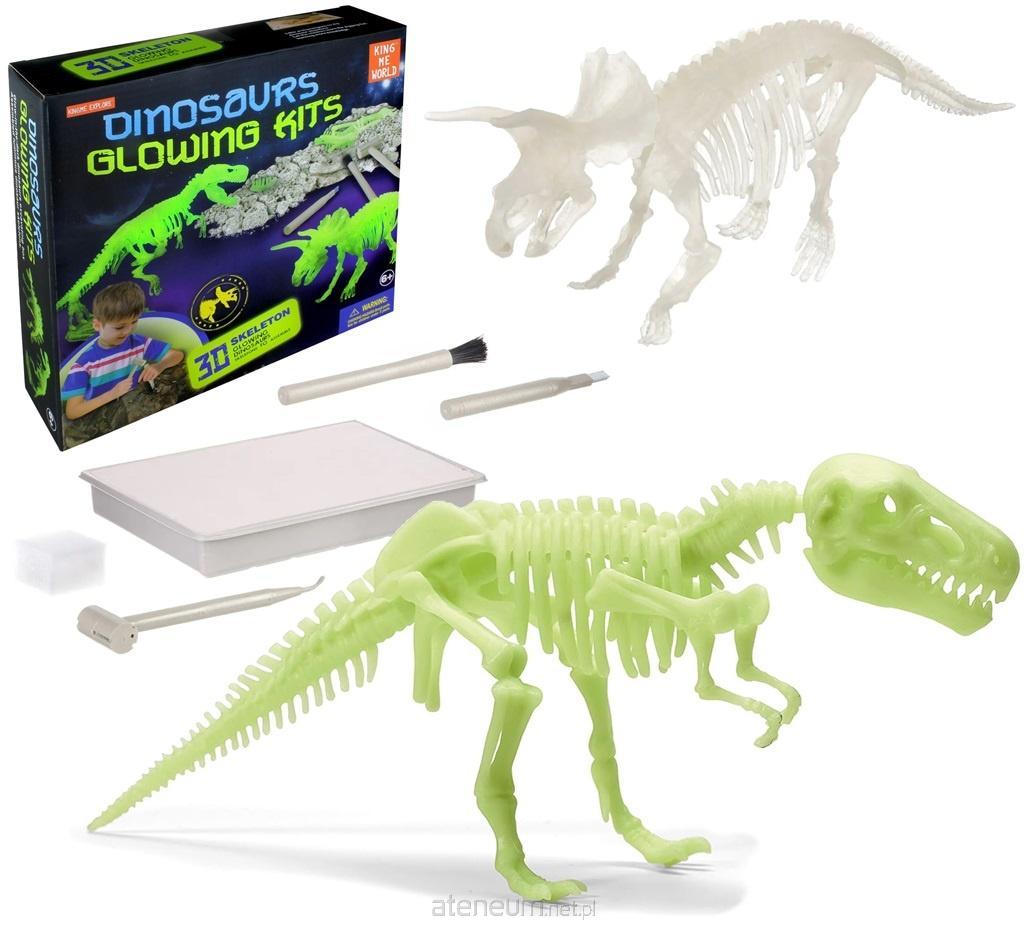 Zestaw zawiera gipsowy odlew z którego za pomocą narzędzi należy wydobyć szkielet dinozaura który świeci w ciemności, świetny zestaw, który pozwoli dziecku poczuć się jak naukowiec paleontolog.