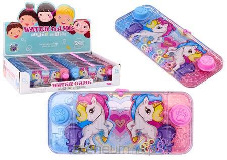 Gra Wodna Konsola Zręcznościowa Różowa Jednorożec Pad Kółeczka To klasyczna wodna gra zręcznościowa z motywem jednorożca, często spotykana w formie niewielkiej, prostokątnej zabawki. Jej mechanizm jest prosty, ale bardzo wciągający. Gra ma kształt prostokąta, co sprawia, że jest wygodna do trzymania w dłoniach. Po prawej i lewej stronie urządzenia znajdują się dwa różowe i niebieskie przyciski ozdobione łapkami zwierzątka. Te przyciski są kluczowe do gry i są łatwo dostępne dla palców gracza. W środku gry, w przezroczystym zbiorniku wypełnionym wodą, znajdują się kolorowe obręcze. Są one swobodnie unoszące się wewnątrz cieczy. W dolnej części gry wystają dwa szpice, na które należy nadziać obręcze. Szpice te są celami, do których gracz musi trafić obręczami. Gracz naciska przyciski, aby wprawić w ruch obręcze. Naciśnięcie jednego z przycisków powoduje, że strumień wody wypycha obręcze w górę. Zadanie gracza polega na precyzyjnym dozowaniu siły nacisku na przyciski. Mocniejsze wciśnięcie przycisku powoduje, że obręcz porusza się wyżej, podczas gdy słabsze naciskanie skutkuje mniejszym ruchem. Wymaga to zręczności i wyczucia. Celem gry jest umieszczenie obręczy na dwóch wystających szpicach. Osiągnięcie tego celu wymaga precyzyjnego sterowania ruchem obręczy, co jest głównym wyzwaniem w grze. Gra rozwija zręczność, koordynację ruchową oraz cierpliwość. Jest prostym, ale efektywnym sposobem na zabawę, oferującym wiele godzin rozrywki dla dzieci i dorosłych. Wymiary gry: 15 cm x 7 cm x 1 cm Cena dotyczy jednej sztuki, w opakowaniu zbiorczym znajdują się 24 szt. Posiada certyfikat CE, ponadto jest zgodny z normą EN71. Zabawka przeznaczona jest dla dzieci powyżej 3 roku życia.
