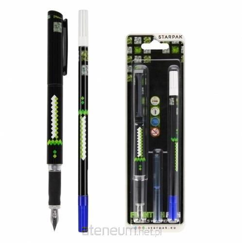 Pióro wieczne Pixel STARPAK o kształcie dostosowanym do dłoni dziecka, z wytrzymałą stalówką, wykonaną z wysokiej jakości materiału. Specjalnie wyprofilowana, antypoślizgowa strefa uchwytu zapewnia komfort i pomaga w nauce pisania Twojego dziecka. Zapoznaj się również z innymi produktami dedykowanymi biurze i szkole! W piórze znajduje się miejsce na zapasowy wkład, dzięki czemu Twojemu dziecku nigdy nie zabraknie atramentu w trakcie pisania. Całość została ozdobiona grafiką Pixel. W zestawie dwa naboje wymienne i dwustronny wymazywacz w pisaku. Końcówka wymazująca oznaczona białą zakrętką skutecznie usuwa błędy, a końcówka korygująca oznaczona niebieską zakrętką pozwala na poprawę błędów. Wymazywacz również został ozdobiony nadrukiem Pixel, dzięki czemu tworzy komplet z piórem wiecznym. Wykonane z trwałego materiału. Zestaw pakowany na blistrze. Produkt nieodpowiedni dla dzieci poniżej 3 lat. Wymiary produktu (pióro) 13 cm