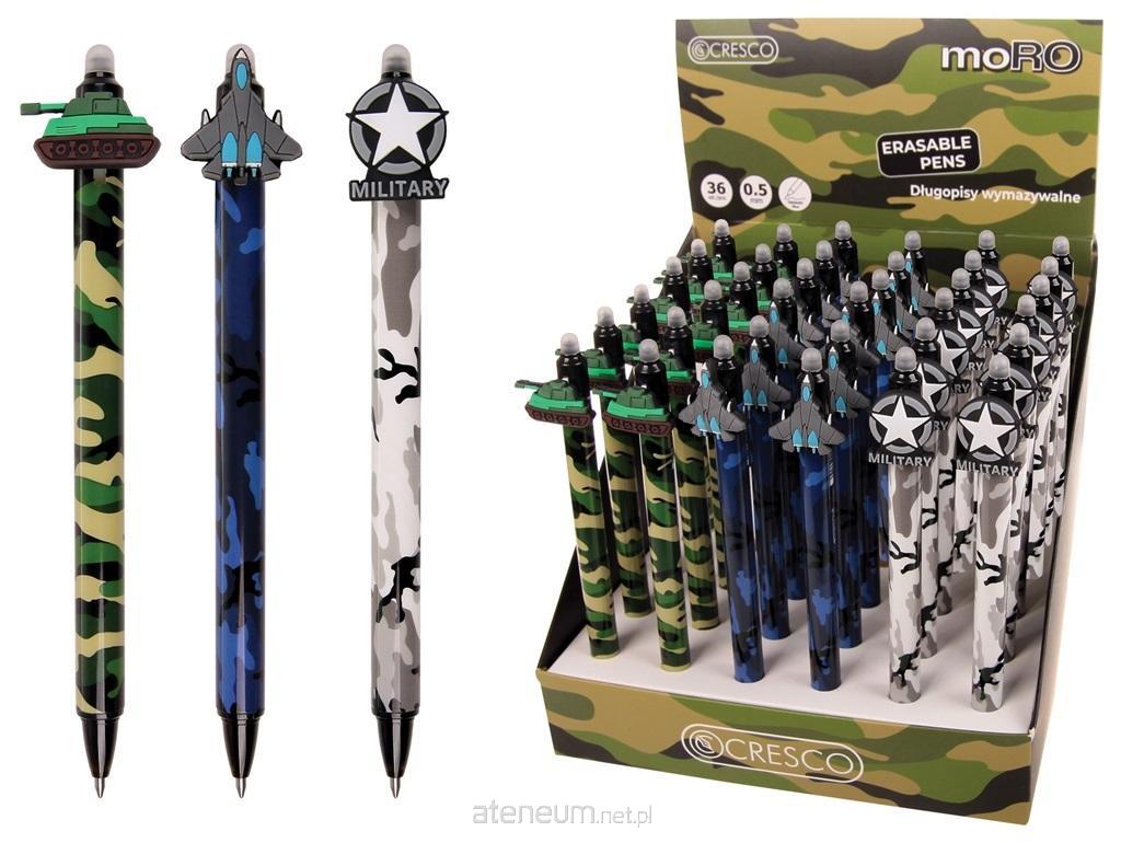 Długopis wymazywalny CRESCO o tematyce MILITARNEJ. Pstrykany system wysuwania niebieskiego wkładu o linii pisania 0,5mm. Opakowanie zawiera 36szt w mixie wzorów.