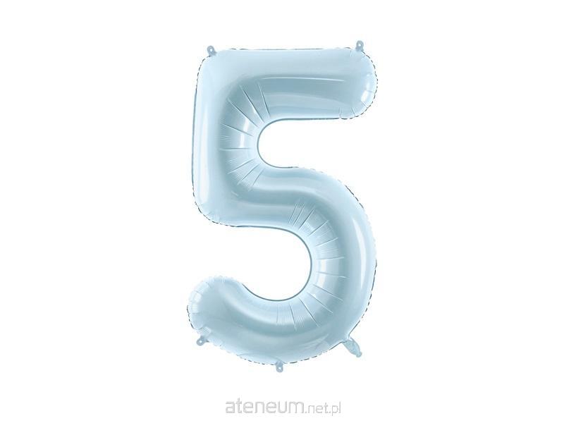 Balon foliowy pastelowy Cyfra ''5'' w kolorze jasnoniebieskim , rozmiar przed napompowaniem ok. 86 cm (34''), rozmiar po napompowaniu ok. 72 cm (28''). Do napompowania powietrzem i helem. Zestaw zawiera słomkę