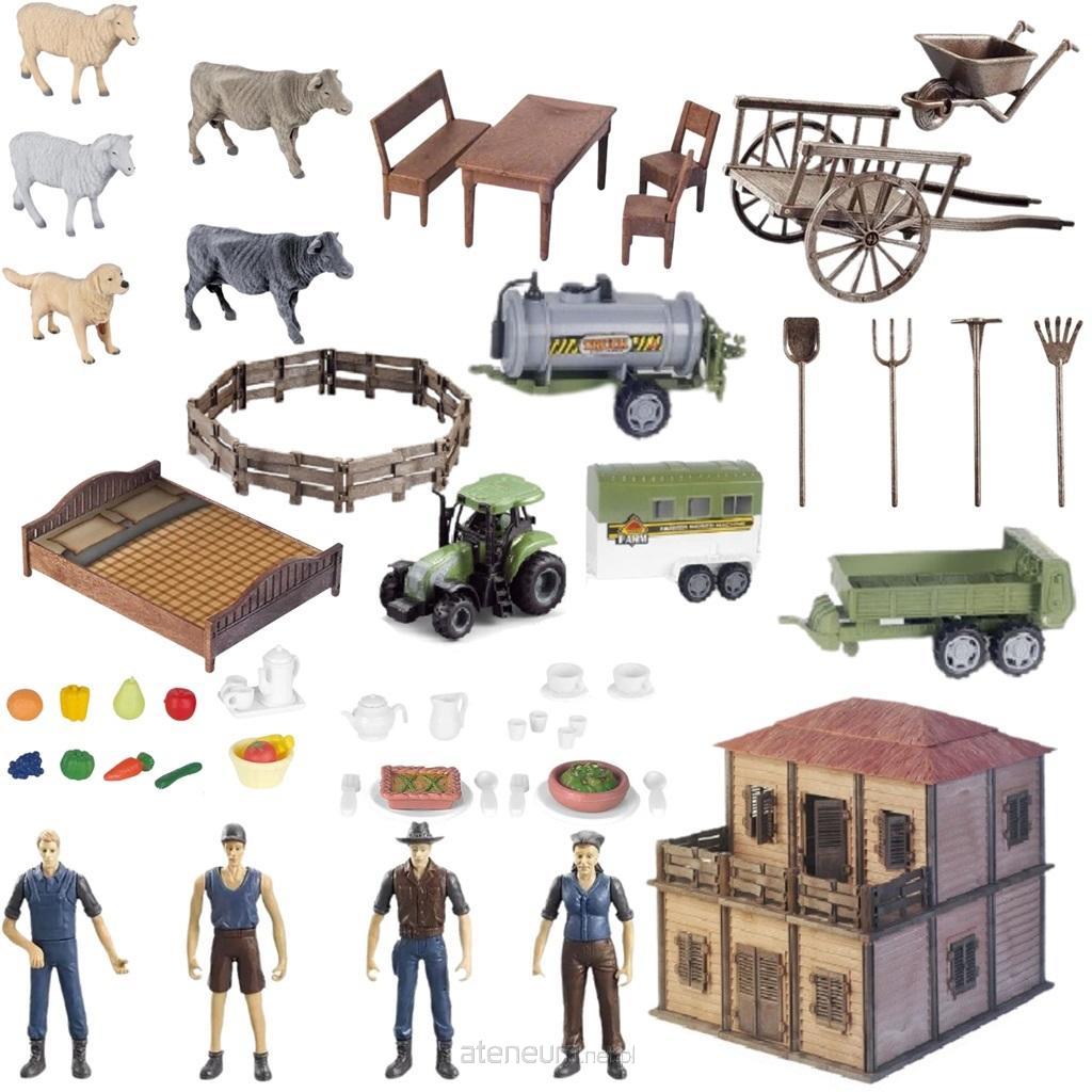 Zestaw ten składa się z wielu elementów, które pozwalają dziecku stworzyć swoją wymarzoną farmę. Domek, narzędzia rolnicze, stół, krzesła, ławka, łóżko, zwierzątka, owoce, naczynia i wiele innych detali tworzy realistyczne środowisko wiejskie. Dzieci uwielbiają interakcję, a w tym zestawie znajdują się zarówno sympatyczni rolnicy, jak i urocze zwierzątka wiejskie, takie jak krówki, owieczki i piesek. To doskonała okazja do rozwijania empatii i opiekuńczych umiejętności. Nie może zabraknąć tradycyjnego rolniczego traktora z naczepą w tym zestawie. Dziecko może jeździć nimi po farmie, przewozić owoce czy inne przedmioty i bawić się jak prawdziwy rolnik.