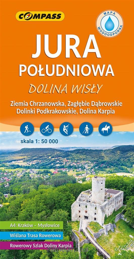 Rodzaj: mapa laminowana dwustronna Skala: 1:50'000 Rok wydania: 2024 Wydanie: 1 Format: B1 (68 x 98 cm) Mapa Jura Południowa w skali 1:50 000 to uzupełnienie mapy Jury Krakowsko-Częstochowskiej. Nowy arkusz sięga na południe aż po dolinę Wisły i Dolinę Karpia, zahaczając o Skawinę i Zator. Zasięg na północy wyznaczają Siewierz i Ogrodzieniec, na wschodzie Olkusz i Kraków, na zachodzie Sosnowiec i Oświęcim. Mapa obejmuje fragmenty Ziemi Chrzanowskiej, Zagłębia Dąbrowskiego oraz Dolinek Podkrakowskich. Mapa przyda się do uprawiania wszelkich form turystyki - pieszej, rowerowej, konnej czy samochodowej. Bez trudu znaleźć na niej można wszystkie atrakcje, w tym znane zamki i warownie, jaskinie, zabytki architektury drewnianej i wiele innych. Miłośnikom dwóch kółek z pewnością przypadną do gustu szlaki i trasy rowerowe, w tym Wiślana Trasa Rowerowa, Szlak Doliny Karpia czy Rowerowy Szlak Orlich Gniazd. Na piechurów czekają z kolei dziesiątki pieszych szlaków, ścieżek spacerowych i dydaktycznych.