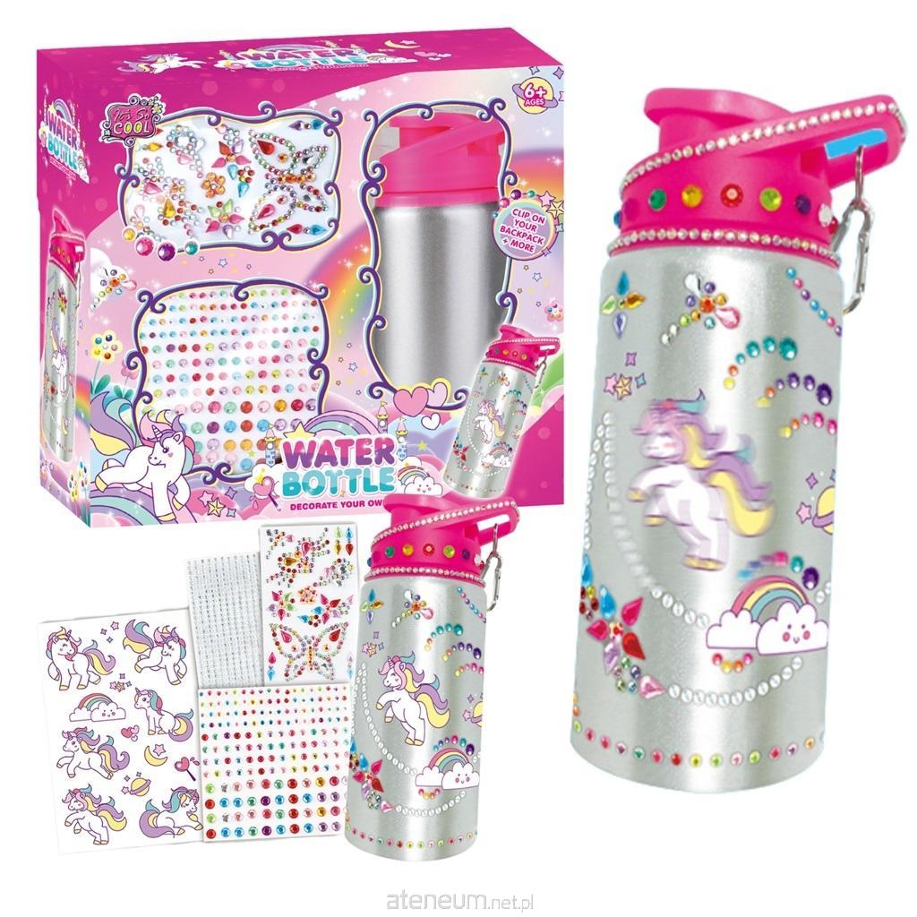 Zestaw zawiera butelkę na wodę, naklejki oraz diamenciki. Wystarczy oderwać naklejkę z wybranym wzorem i przykleić do butelki. Dzięki temu dzieci mają szansę na tworzenie różnorodnych kompozycji, układając wybrane wzory.