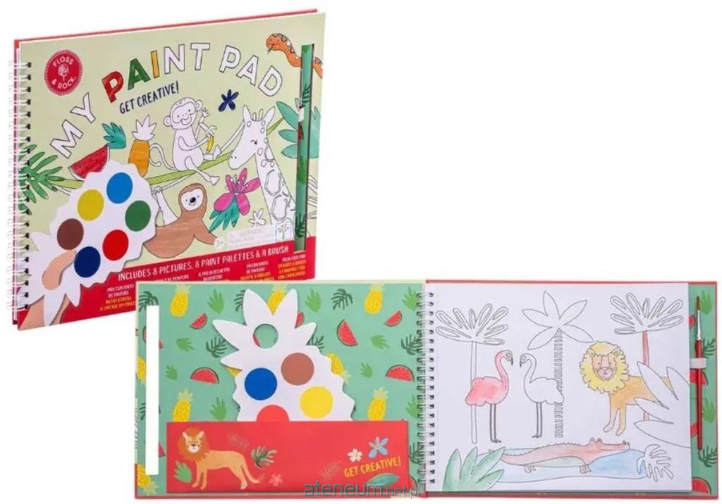 Zestaw kreatywnych kolorowanek z farbkami zawiera 8 wspaniałych obrazków z motywem dżungli do pomalowania oraz 8 palet farbek w kształcie ananasa, a także praktyczny pędzelek. Za pomocą delikatnego pociągnięcia pędzelka nawilżonego niewielką ilością wody i farbki można namalować swój własny obrazek! Palety z farbkami i pędzelek są bezpiecznie przechowywane w spiralnie oprawionej okładce, gdy nie są używane, dzięki czemu kolorowanki idealnie nadają się do malowania w podróży!