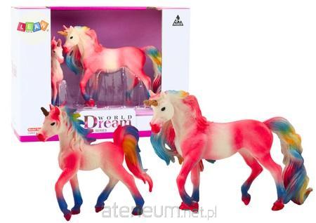 Figurki Kolekcjonerskie Jednorożec z Małym Różowy 2 El Figurki jednorożców, przedstawiające dorosłego jednorożca z małym, to wyjątkowy zestaw, który z pewnością zachwyci każdą miłośniczkę tych baśniowych stworzeń. Oba jednorożce są w kolorze różowym, co nadaje im magiczny wygląd. Realistycznie odwzorowane faktury sprawiają, że figurki wyglądają niemal jak żywe, co dodatkowo podkreśla ich wyjątkowość i staranność wykonania. Grzywa i ogon obu jednorożców są kolorowe, co dodaje im bajkowego uroku i przyciąga wzrok swoimi żywymi barwami. Te kolorowe elementy wspaniale kontrastują z różowym ciałem, tworząc harmonijną i estetyczną całość, która ożywia każdą scenę, w której się znajdują. Jednorożce, będące jednym z najbardziej rozpoznawalnych i ukochanych baśniowych stworzeń, stają się źródłem niekończącej się inspiracji i rozwoju wyobraźni. Dzieci, szczególnie wielbicielki jednorożców, mogą tworzyć nieskończone historie i przygody, korzystając z tych figurek, co rozwija ich kreatywność i zdolności narracyjne. Figurki są wykonane z solidnego i trwałego materiału, co gwarantuje ich wytrzymałość i długowieczność. Dzięki temu są odporne na uszkodzenia, co pozwala na intensywną zabawę bez obawy o zniszczenie. Dzięki swojemu estetycznemu wykonaniu, figurka jednorożca może służyć nie tylko jako zabawka, ale również jako urocza ozdoba pokoju lub element kolekcji. Wymiary dorosłego jednorożca: 13,5cm x 10cm x 4cm Wymiary małego jednorożca: 9,5cm x 8,5cm x 2,5cm Wymiary opakowania: 20cm x 15cm x 9,5cm Posiada certyfikat CE, ponadto jest zgodny z normą EN71. Przeznaczony dla dzieci powyżej 3 roku życia.