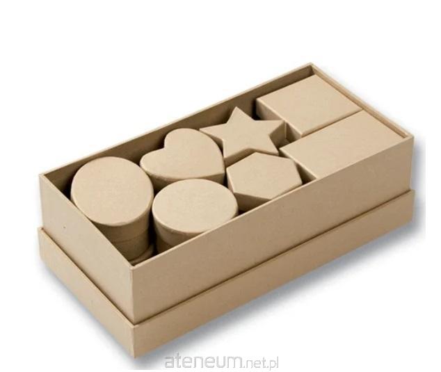 Zestaw 15 pudełek , składający się z jednego dużego prostokątnego pudełka o wymiarach 24x12x8 cm oraz po 2 małe pudełka w następujących kształtach : gwiazda, owal, prostokąt, kwadrat, koło, serce, sześciokąt. Kolor pudełek : naturalny .