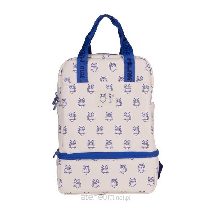 Plecak szkolny, prostokątny z dolną komorą izolowaną termicznie (zimno/ciepło) dla lepszego przechowywania żywności, o pojemności 2 l. Kolor beżowy z granatowym wzorem sowy. Kolekcja 460 inspirowana oryginalnymi kolorami i wzornictwem gumek MILAN, produkowanych w Hiszpanii od 1918 roku. Zapięcie na zamek błyskawiczny. Duża komora wewnętrzna i dwie kieszenie boczne na butelki lub małe przedmioty. Regulowane paski na ramię, regulowane paski z przodu i uchwyty do przenoszenia w jaskrawym niebieskim kolorze. Niebieska wzorzysta podszewka wewnętrzna. Skład materiału zewnętrznego: 100% poliuretan. Skład wewnętrznej podszewki: 100% poliester (duża komora wewnętrzna) i P.E.V.A. (komora dolna). Wymiary: 33 x 25 x 13 cm. Pojemność: 13,5 l.