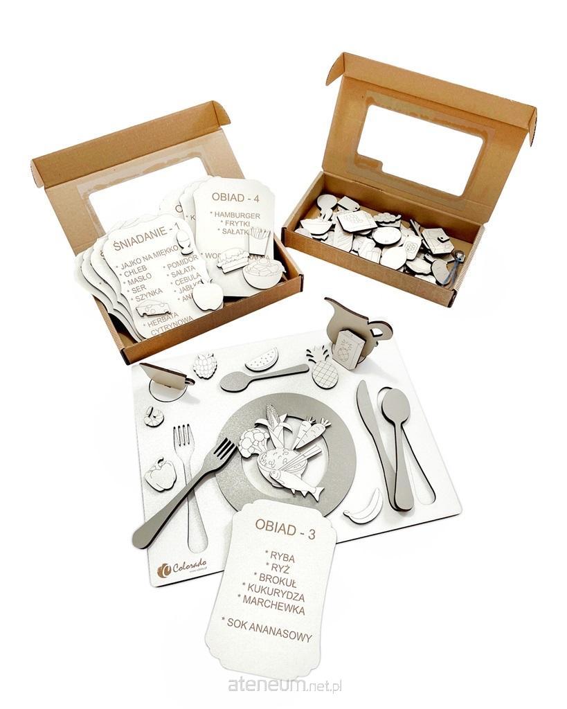 Zestaw zawiera 85 elementów (bazę, 4 sztućce, talerz, filiżankę, dzbanek, 4 menu śniadaniowe, 4 menu obiadowe, 69 produktów spożywczych)