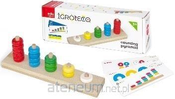 W zestawie: drewniana platforma, 15 drewnianych krążków w różnych kolorach, 20 kart z zadaniami