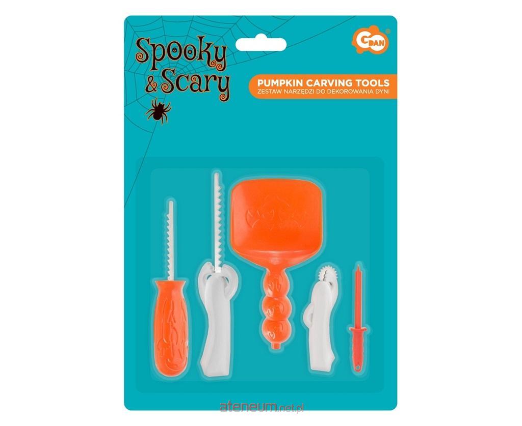 Zestaw zawiera: 1. Piłkę do wycinania wieczka i dużych części wzoru. 2. Mniejszą bardzo ostrą piłkę, do precyzyjnego wycinania. 3. Łopatka do wydrążania środka dyni i ścinania grubości przedniej ścianki dyni. 4. Nóż krążkowy do wykrajania wzoru. 5. Dłuto.