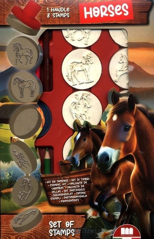 Pieczątki z końmi. W skład zestawu wchodzi: 8 pieczątek, 1 poduszeczka do tuszu i 10 arkuszy, 8 pisaków, 1 uchwyt.