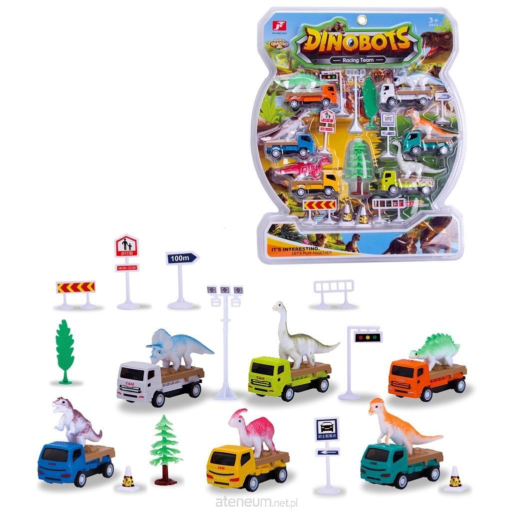 Zestaw 6 aut ciężarowych z dinozaurami oraz znakami.