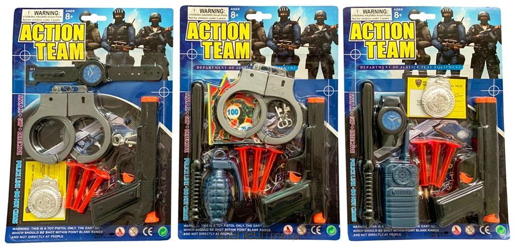 Zestaw akcesoriów policyjnych z pistoletem na miękkie strzałki.