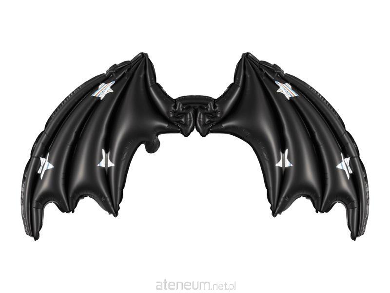 Balon foliowy w kształcie skrzydeł nietoperza, ze sznurkami do przywiązania do pleców, kolor czarny matowy z holograficznymi gwiazdkami, wym. ok. 85 x 50 cm. Do napompowania powietrzem. Zestaw zawiera słomkę.