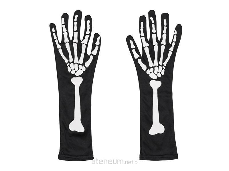 Rękawice świecące w ciemności, w kolorze czarnym z motywem ręki kościotrupa o rozmiarze S/M, długość ok. 39.5 cm, obwód ok. 30 cm. Skład: poliester - 100%. Sposób konserwacji: prać ręcznie.