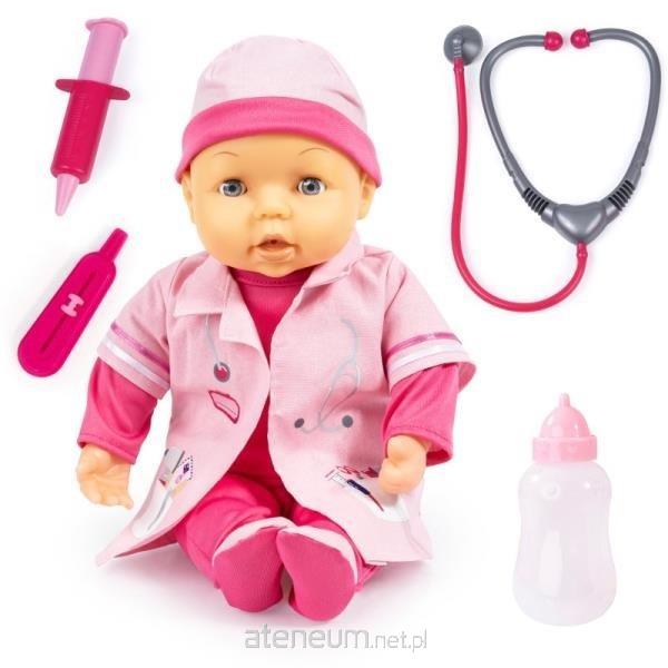 Przepiękny mały bobas z 25 funkcjami to świetna zabawka dla dzieci, dostarczająca mnóstwo nauki i wspaniałej zabawy. Laleczka odznacza się uroczą, niemowlęcą buzią. Ubrana jest w różowy kombinezon, narzutkę doktora i różową czapeczkę. Lalka posiada około 38cm wzrostu, co sprawia, że jest idealna do przytulania, dając dziecku poczucie bliskości. Wymaga zasilania 3 bateriami AAA (dołączono), aby usłyszeć efekty dźwiękowe. Co więcej, do zestawu dołączono stetoskop, termometr, strzykawkę i butelkę dla lalki. Gdy laleczka ma gorączkę, policzki będą się jej świecić przez 15 sekund. Aby to zmienić, musisz dać jej zastrzyk w plecy. Przykładając stetoskop do jej serca, usłyszysz bicie jej serca. Jeśli podasz jej butelkę, wyda dźwięki picia. Po skończeniu picia odbija jej się. Zabawa z nią pobudza wyobraźnię i kreatywność dziecka oraz uczy opieki i troski nad drugą osobą. Dostawa w pięknym pudełku wystawowym z okienkiem. Zawartość: - 1 lalka w ubranku doktora. - 1 butelka, - 1 stetoskop, - 1 termometr, - 1 strzykawka, - instrukcja.