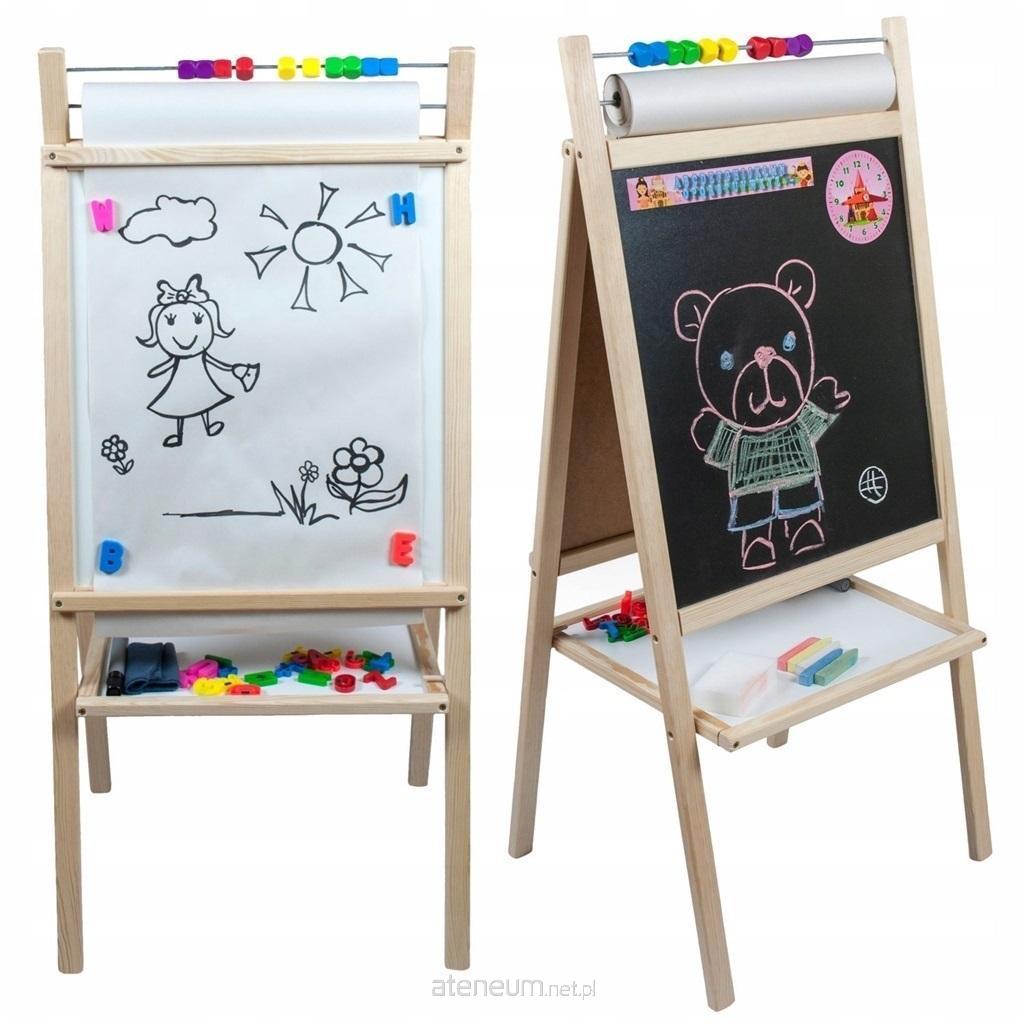 Średnia magnetyczna dwustronna tablica drewniana - naturalna z rolką papieru, liczydłem, zegarem, alfabetem. Tablica zawiera kredę, gąbkę, literki magnetyczne oraz marker.