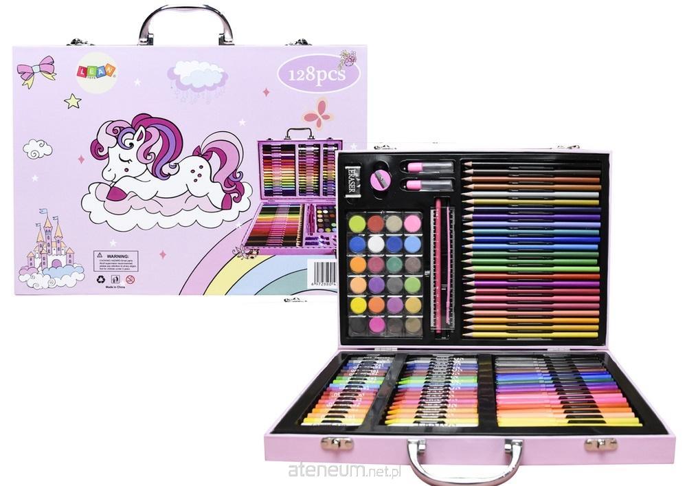 Zestaw Artystyczny W Walizce Z Jednorożcem Różowa 128 EL Zestaw artystyczny składający się z 128 elementów to wymarzone narzędzie dla każdego młodego artysty, który chce rozwijać swoją wyobraźnię i umiejętności plastyczne. Zestaw został zaprojektowany z myślą o małych twórcach, zapewniając im wszystkie niezbędne materiały do realizacji różnorodnych projektów artystycznych. Cały zestaw jest zapakowany w elegancką, różową walizkę która przyciąga wzrok swoim motywem jednorożca. W środku walizki znajduje się szeroki wachlarz narzędzi artystycznych, które pozwalają na realizację pomysłów w różnych technikach plastycznych. W skład zestawu wchodzą kredki ołówkowe, pastele, piaski, farbki, pędzelek, linijkę, gumkę oraz strugaczkę. Ten wszechstronny zestaw artystyczny jest doskonałym wyborem dla każdego dziecka, które chce wyrażać siebie poprzez sztukę. Dzięki bogactwu narzędzi i akcesoriów, młodzi artyści mogą odkrywać różnorodne techniki plastyczne, tworzyć wyjątkowe dzieła i czerpać radość z kreatywnego procesu. Walizka z motywem jednorożca nie tylko chroni zawartość, ale również dodaje zestawowi wyjątkowego uroku, czyniąc go idealnym prezentem na każdą okazję. Wymiary walizki: 35,5cm x 26,5cm x 5cm Posiada certyfikat CE, ponadto jest zgodny z normą EN71. Przeznaczony dla dzieci powyżej 3 roku życia.