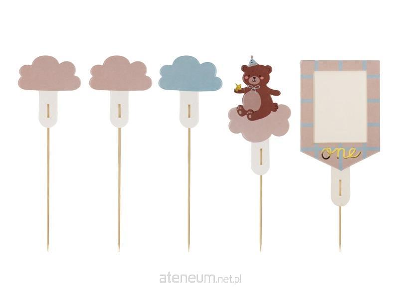 Toppery na tort Miś, mix wzorów i kolorów. Zestaw zawiera 5 karteczek i 5 patyczków. Wysokość po złożeniu ok. 12-14 cm. Produkt do samodzielnego złożenia.(1 op. / 5 szt.)
