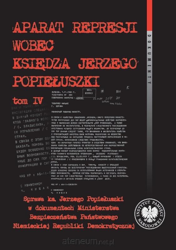 Czwarty tom publikacji Aparat represji wobec księdza Jerzego Popiełuszki zawiera dokumenty wytworzone w Ministerstwie Bezpieczeństwa Państwowego NRD (potocznie nazywanym Stasi) w reakcji na informacje o porwaniu i zamordowaniu kapelana "Solidarności". Najpoważniejsze miejsce w tym zbiorze zajmują materiały przygotowane przez Operativgruppe Warschau - działającą przy Ambasadzie NRD w Warszawie grupę operacyjną należącą do pionu kontrwywiadowczego Stasi, pełniącą wobec MSW PRL funkcję "placówki zaprzyjaźnionej służby". Sprawa uprowadzenia i zabójstwa duchownego, jako jeden z największych wstrząsów politycznych w PRL po 13 grudnia 1981 r., miała dla wschodnioniemieckiej policji politycznej niebagatelne znaczenie. Z jednej strony ukazywała bowiem kryzys wewnątrz struktur bezpieczeństwa PRL, a z drugiej reakcje Polaków na okrutną śmierć ks. Popiełuszki. Uzyskanie szczegółowych wyjaśnień na temat przyczyn, przebiegu i sprawców tej zbrodni nie było z pewnością celem dociekań funkcjonariuszy Stasi. W centrum ich zainteresowania znajdował się raczej wpływ tego morderstwa na sytuację w Polsce, a w szczególności na sytuację wewnątrz MSW i PZPR.