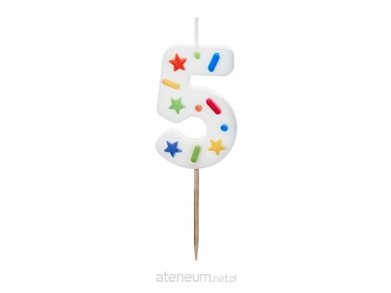Świeczka urodzinowa Cyfra 5 w kolorze białym z konfetti na drewnianym patyczku, wysokość cyfry ok. 5.5 cm, wysokość całkowita ok. 10 cm.