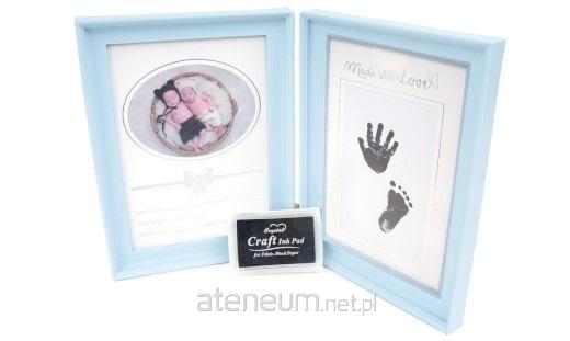 plastikowa podwójna ramka, rozmiar ramki 31,5 x 20,6 cm, szerokość listwy 2 cm, do postawienia, zawiera tusz do wykonania odcisku dłoni lub stopy dziecka