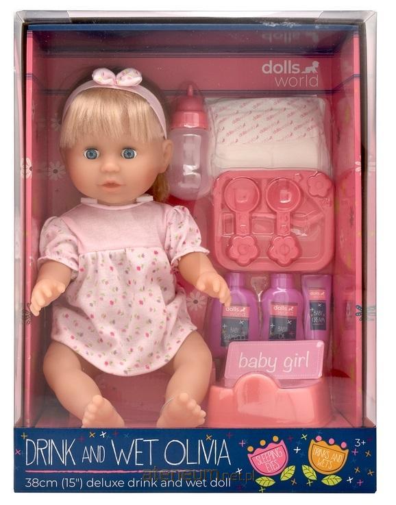 Pijąca i sikająca lalka Olivia o wielkości 38cm. Posiada włosy, śpiące oczka, zdejmowane ubranko i kokardkę na włosy. W opakowaniu znajdują się akcesoria do urozmaicenia zabawy: nocnik, widelczyk, łyżeczka, butelka do picia, 3 butelki do kąpieli oraz pieluszka