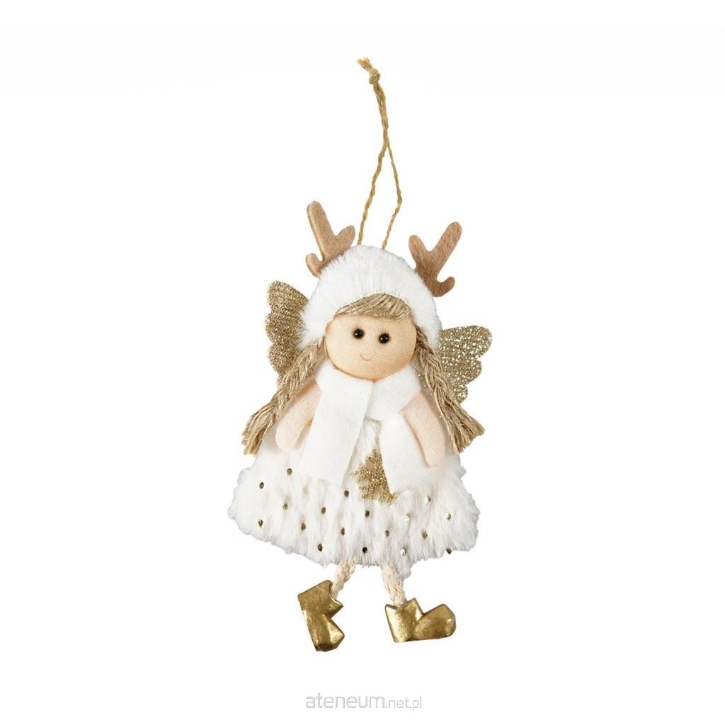 Świąteczna zawieszka dekoracyjna w kształcie aniołka. Dostępna w trzech wariantach kolorystycznych - białym, różowym oraz szarym. Ozdoba zawiera błyszczące elementy brokatowe. Sukienka oraz czapeczka aniołka została wykonana z materiału imitującego futerko. Nóżki są ze sznurka, nieusztywnione. Dekoracja zawiera sznurek umożliwiający powieszenie ozdoby. Wymiar zawieszki: 15 cm.
