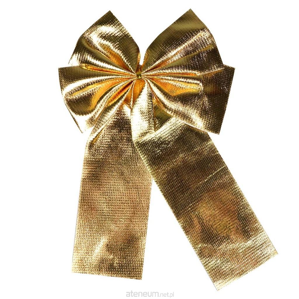 Duża kokarda dekoracyjna w kolorze złotym. Idealnie sprawdzi się w kompozycjach dekoracyjnych, świątecznych jak i do dekoracji prezentów. Ozdoba świąteczna o wymiarze: 15 x 23 cm.