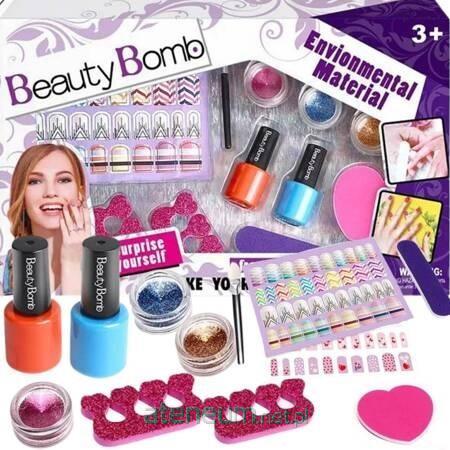 W zestawie znajdują się aż 2 lakiery w różnych, modnych kolorach a także błyszczące ozdoby, które sprawią, że paznokcie dziewczynki będą się wspaniale prezentować!