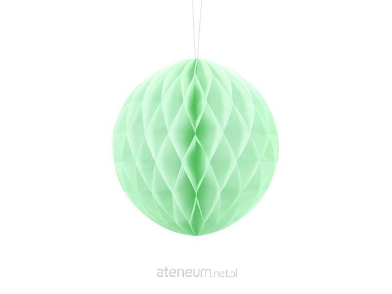 Kula bibułowa w kolorze pistacjowym, o średnicy około 20 centymetrów. Produkt wielokrotnego użytku. Montaż przy pomocy spinacza.