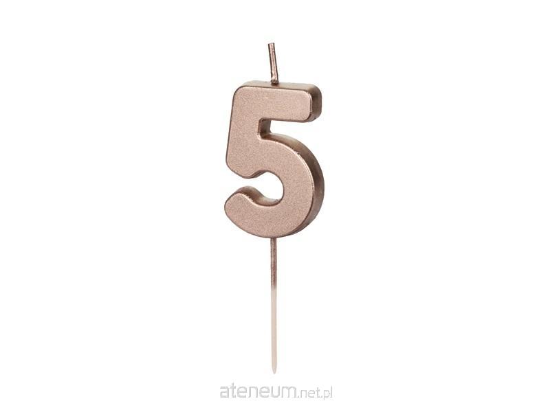 Świeczka urodzinowa Cyferka 5 w kolorze różowego złota na drewnianym patyczku, wysokość cyfry ok. 4.5 cm, wysokość całkowita ok. 9 cm.