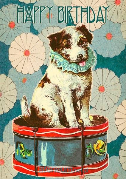 Karnet B6 z kopertą Urodziny Pies i bęben, w środku bez tekstu, wyprodukowany w Wielkiej Brytanii.