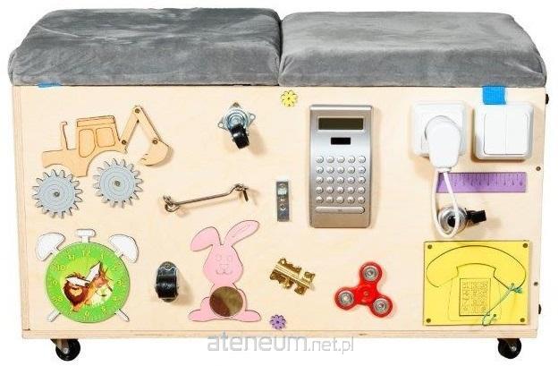 Pufa wyposażona w skrętne kółka. Podnoszone siedzisko z miękką gąbką, obite polarem. Pojemnik podzielony na dwie części