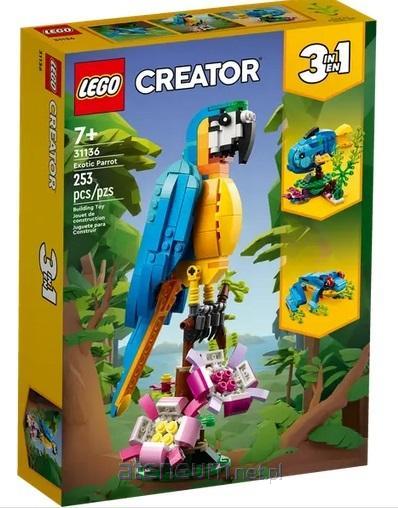 Dzięki zestawowi LEGO® Creator 3 w 1 Egzotyczna papuga (31136) mali budowniczowie i wielbiciele zwierząt w wieku od siedmiu lat wybiorą się w emocjonującą podróż do lasu deszczowego. Zawiera on kolorową papugę, która może obracać ciało, siedząc na gałęzi, a także poruszać skrzydłami i ogonem.