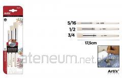 Profesjonalny pędzel do malowania z bardzo miękkiegowłosia syntetycznego. Idealny do farb temperowych,olejnych lub akrylowych. Drewniany korpuslakierowany na czarno. Długość: 21 cm. Blisterpo 5 sztuk: 4 płaskie szczotki okuciowe nr8, 10, 15 i 20 oraz jedna runda nr 2.