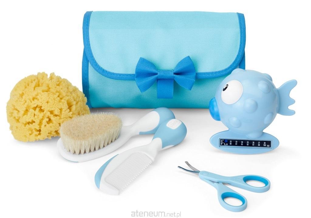 Zestaw pierwszych, niezbędnych do higieny i komfortu noworodka akcesoriów, zamknięty w praktycznej, możliwej do zawieszenia na ścianie kosmetyczce, do użytku w domu i w podróży.