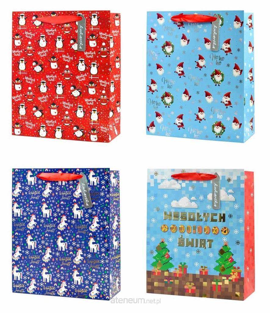 Cechy szczególne: typ produktu: torba na prezent, zdobienie: metalizowana, kolorowa folia, wielkość: 17,7 x 22,8 x 9,8 cm okazja: Boże Narodzenie