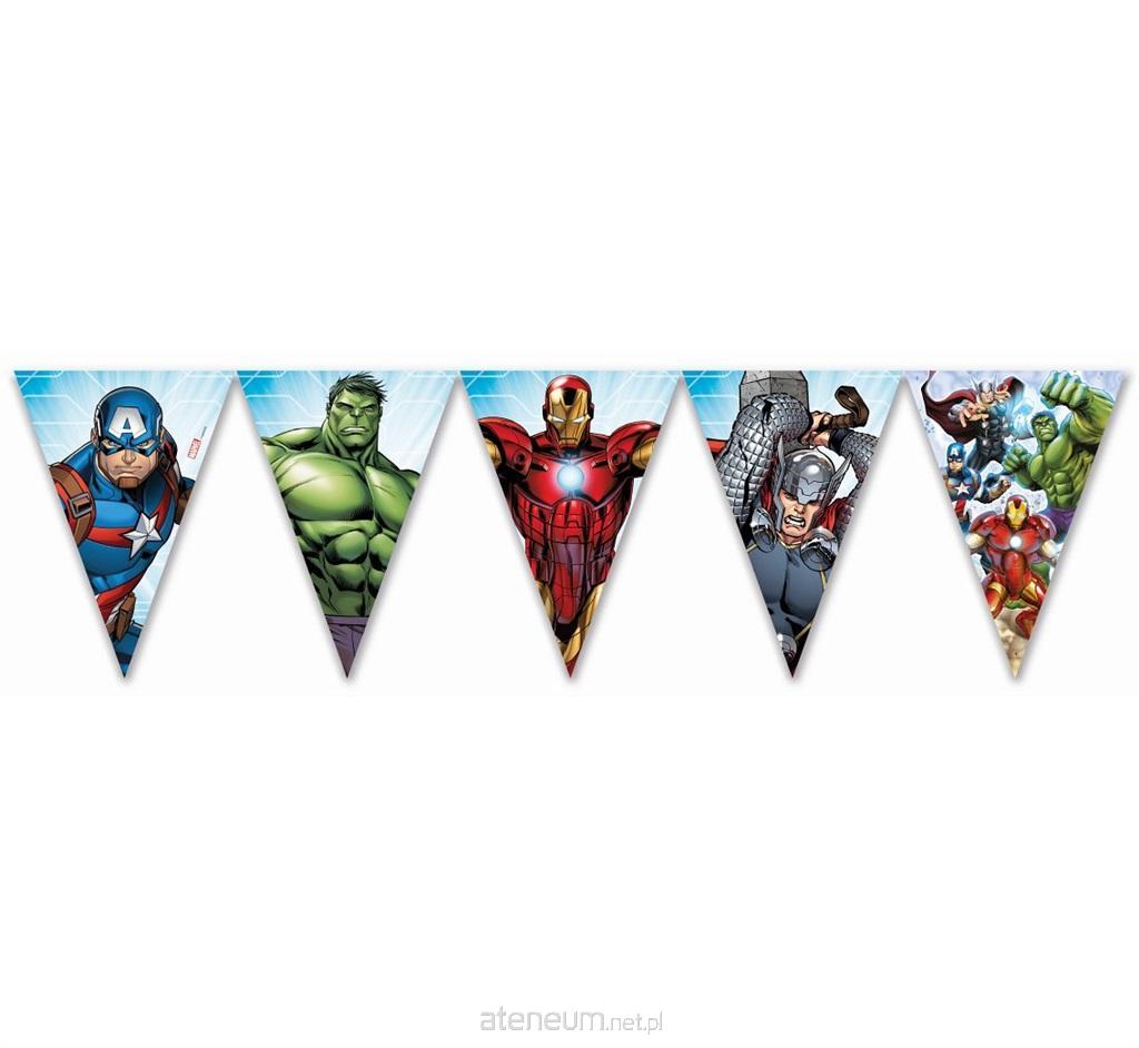 BANNER "MIGHTY AVENGERS" FLAGIWymiary flagi: 26 x 17 cmDługość całkowita: 2,3 mBanner składa się z 9 flag umieszczonych na tasiemce.Foliowy banner z bohaterami z filmu "Avengers".