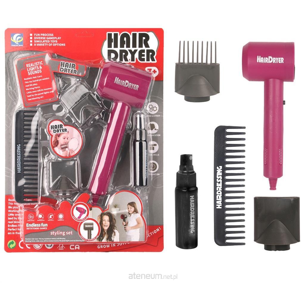 Zestaw fryzjerski z suszarką. Zabawa zestawem pobudza wyobraźnię i kształtuje umiejętność odgrywania ról.