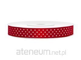 Tasiemka satynowa w kolorze czerwonym w białe kropki, szerokość 12 milimetrów, długość 25 metrów.(1 szt. / 25 mb.)