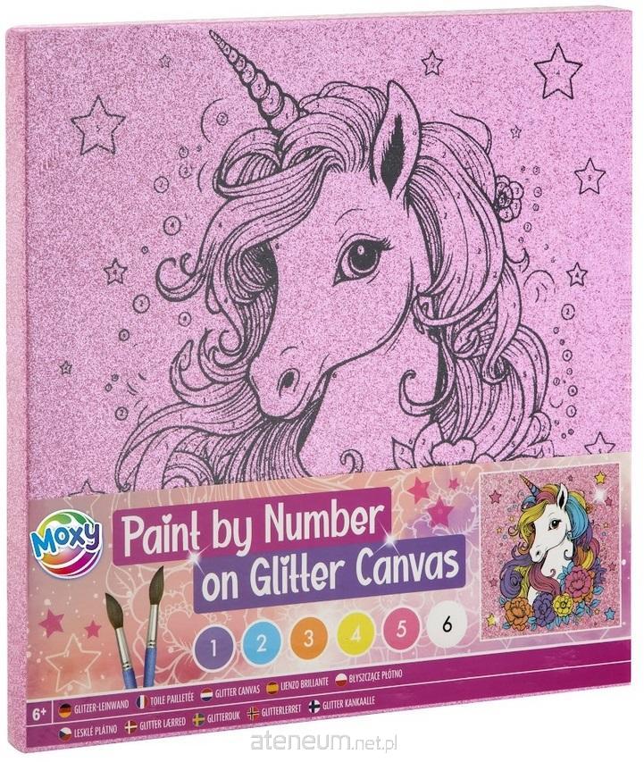 Malowanie po numerach, na płótnie brokatowym, o wymiarach 25x25 cm. Dostępne 3 rodzaje: Zółw, Jednorożec, Mandala kwiatowa