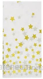 Obrus w złote gwiazdki - biały, 1 sztuka, wymiar 137x274cm. Uniwersalny biały obrus w gwiazdki, idealny na różnego rodzaju imprezy, w tym sylwestra, bal karnawałowy. Wykonany z materiału PEVA, zapewnia elegancki wygląd i trwałość. Obrus o wymiarach doskonałych do stołu bankietowego, dodaje estetycznego wyglądu aranżacji stołu. Klasyczny biały obrus z motywem gwiazdek jest gotowy do użycia bez dodatkowych przygotowań. Jego elegancka powierzchnia stanowi doskonałe tło dla różnorodnych dekoracji stołowych, co pozwala na tworzenie unikalnych kompozycji na każdą okazję. Wszechstronne zastosowanie - idealny jako obrus na stół podczas imprez, przyjęć, sylwestra oraz innych uroczystości wymagających wyjątkowego akcentu. Zapewnia wygodne użytkowanie, uniwersalny design sprawia, że pasuje do różnych stylów dekoracyjnych.