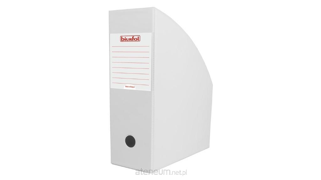 Wykonany z kolorowej folii PVC, wewnątrz usztywniony tekturą. Format A4 o ściętych bokach. Wyposażony w kieszonkę z wymienną etykietą opisową na grzbiecie. Okrągłe wycięcie na palec pozwalające na łatwe wysuwanie pojemnika. Szerokość grzbietu 10 cm.