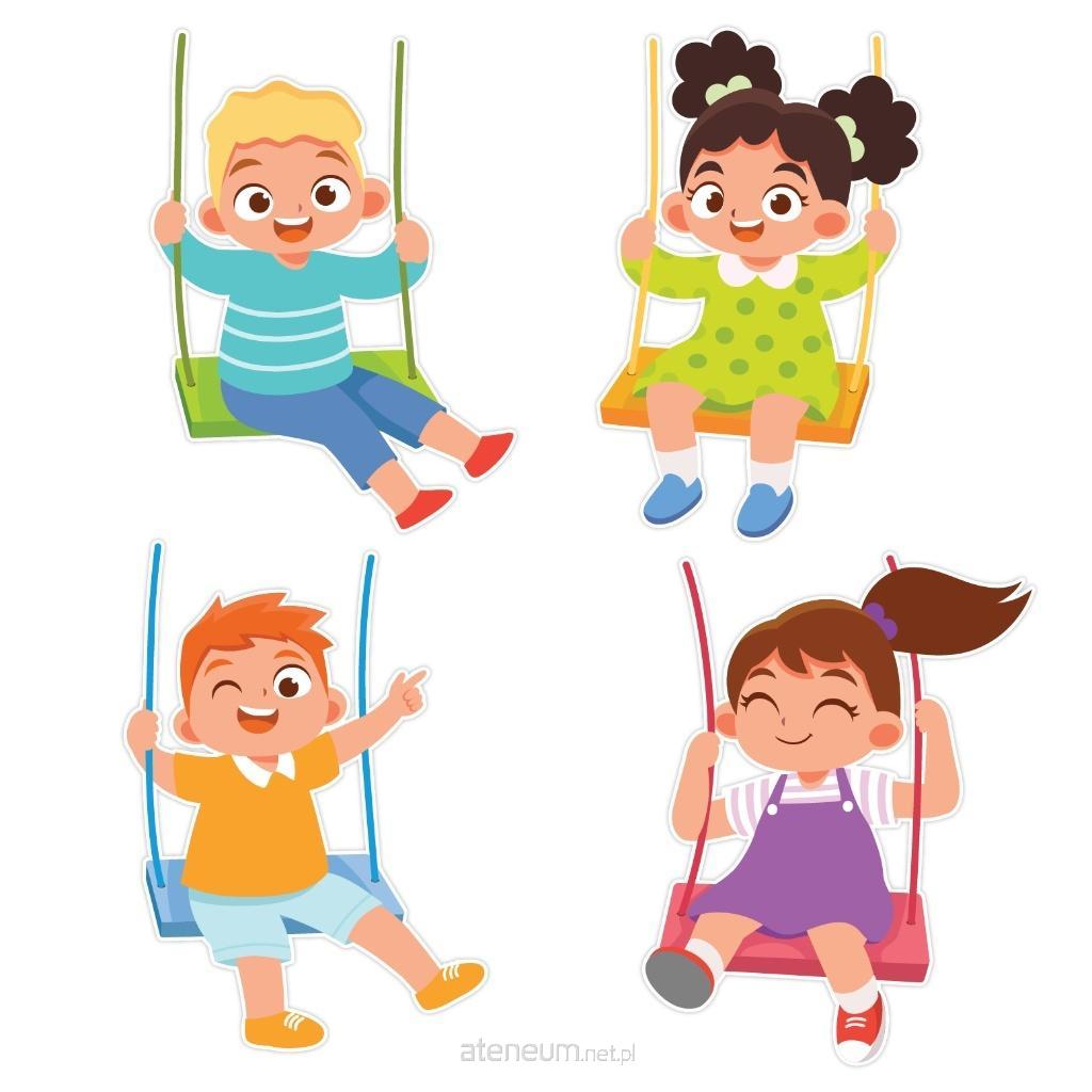 Zestaw składa się z 4 radosnych dzieci na huśtawkach - idealne do wiosennej dekoracji szkoły i przedszkola.