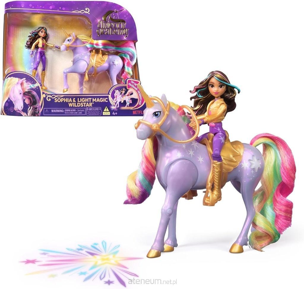 Doświadcz magii Akademii Jednorożców z Sophią i Magią Światła Gwiazdy! Ten duet, zainspirowany serialem animowanym NETFLIX i bestsellerową serią książek o przyjaźni, celebruje wyjątkową więź między jeźdźcem a jednorożcem. Dzięki wiernie odwzorowanym detalom, miękkiej tęczowej grzywie i ogonowi, a także prawdziwym efektom świetlnym Gwiazdy, zestaw ten pobudzi magię wyobraźni. Dzięki 7 punktom zgięcia możesz ustawić Sophię tak, by dosiadła Gwiazdy i nacisnąć przycisk z gwiazdką na boku jednorożca, by włączyć światła (w zestawie 3 baterie LR44) i odtworzyć ulubione sceny. Gwiazda tupie kopytem, używając swojej Magii Światła, aby wyświetlić tęczowy wzór, tak jak w serialu! Sophia bezpiecznie trzyma się na Gwiazdy dzięki zdejmowanej uździe i akcesoriom do siodła. Aby uzyskać więcej sposobów na poznanie Akademii Jednorożców z ulubionymi postaciami, poszukaj innych małych lalek, w tym Avy, Layli, Isabel, Valentiny i ich jednorożców (zestawy sprzedawane osobno) aby rozbudować świat znany z ksiązek i serialu! Zabawki z serii Akademia Jednorożców to wspaniałe prezenty świąteczne lub okolicznościowe dla dzieci, które lubią zabawkowe jednorożce i konie, lalki i akcesoria, domki dla lalek, przedmioty kolekcjonerskie, pluszaki i nie tylko. Zabłyśnij w swoich przygodach w Akademii Jednorożca z Sophią i Magią Światła Gwiazdy!